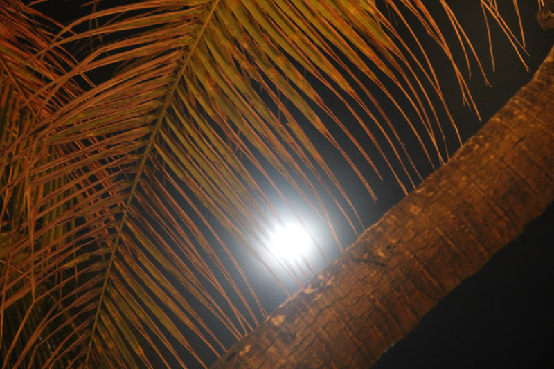 moon peeking though the leaves while we're sitting on the beach